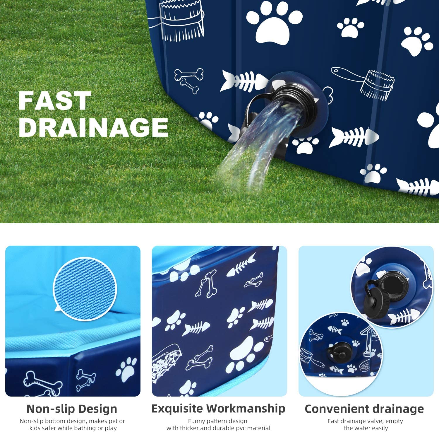 Easy to Use: No need air pump, just unfold the dog tub to use. Make sure the drain cover is tightly closed and then filling with water. The foldable dog tub can be fold into a smaller size for store and saving space, or you can carry it in the car so that you can have water fun with your friendly pets when traveling or camping.